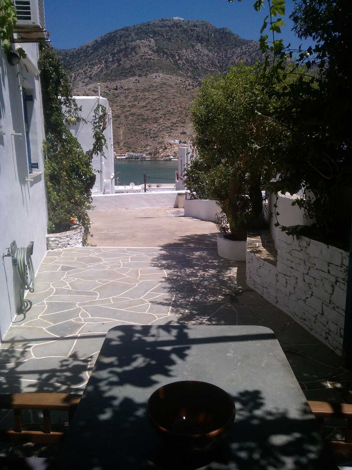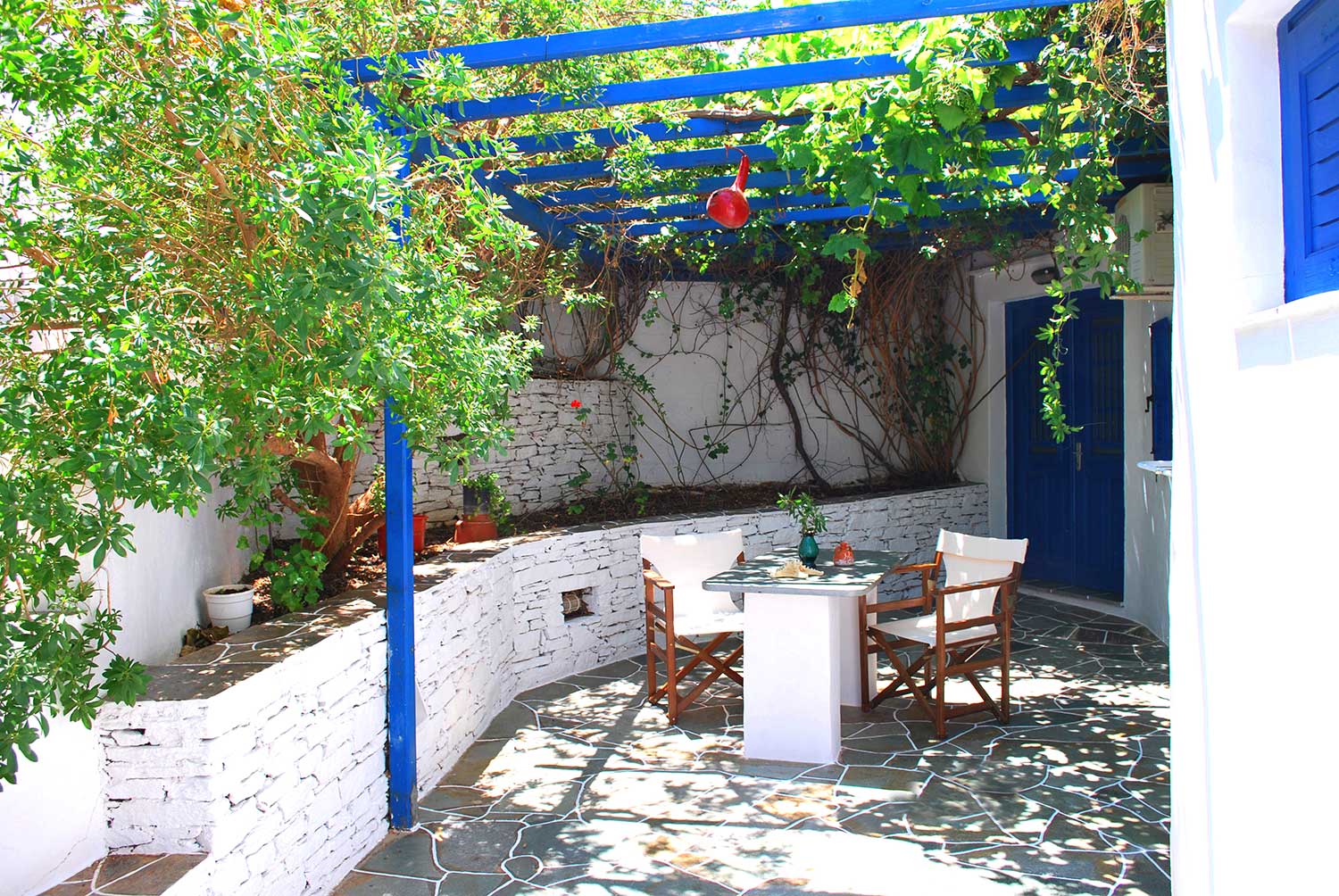 Η ιδιωτική του αυλή, σκεπασμένη με κληματαριά και περιτριγυρισμένη από ανθισμένα φυτά, προσφέρει μια δροσερή γωνιά με όμορφη θέα προς τη θάλασσα και τα γύρω βουνά — ιδανική για πρωινό ή χαλάρωση μετά το μπάνιο.