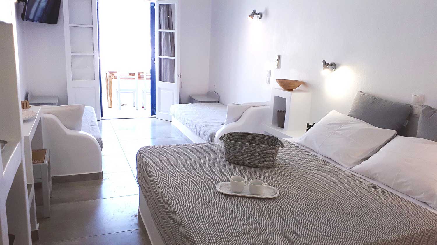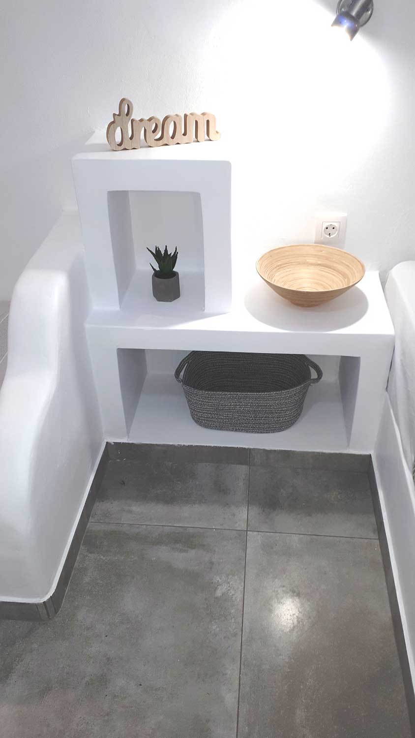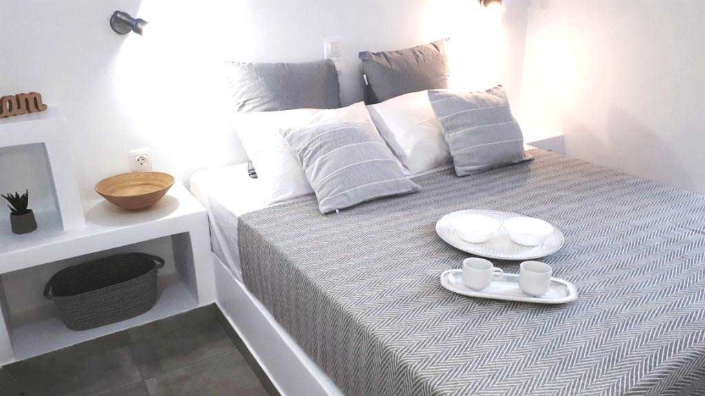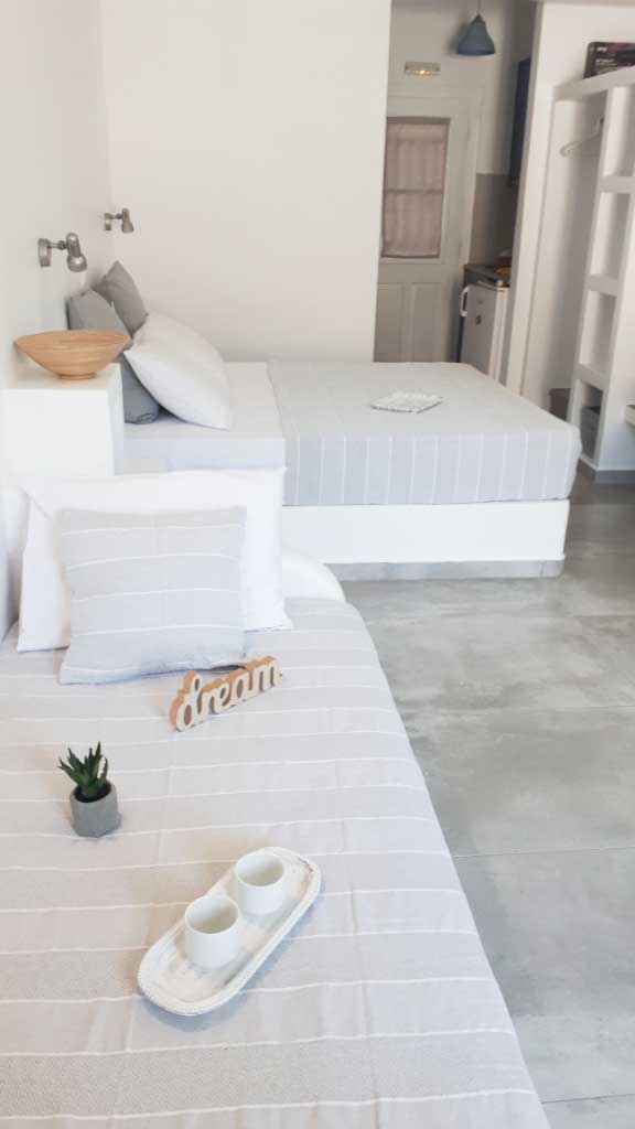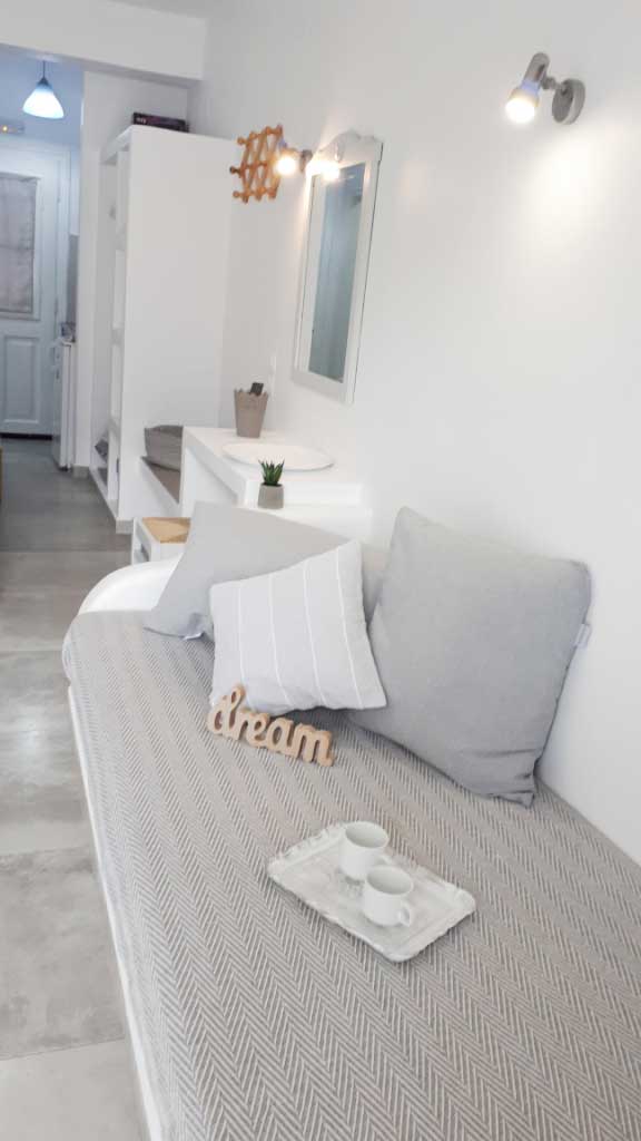 Το Studio 3 είναι ένας ευρύχωρος, φωτεινός χώρος με κυκλαδίτικο χαρακτήρα και μοντέρνα απλότητα. Με γκρι τόνους και χτιστά έπιπλα, δημιουργεί ένα γαλήνιο περιβάλλον ιδανικό για ξεκούραση.